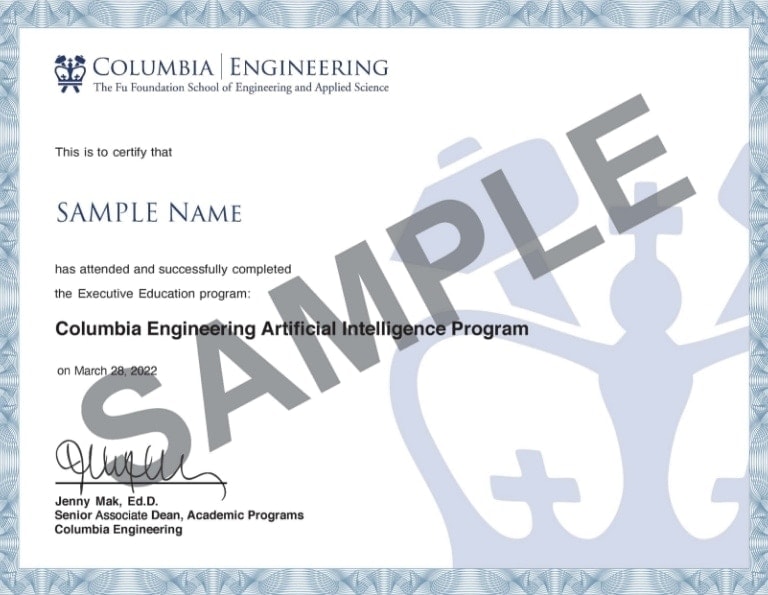 Learners who successfully complete the online AI program will earn a non-credit certificate from the Fu Foundation School of Engineering and Applied Science. This qualification recognizes your advanced skill set and signals to your entire network that you’re qualified to harness AI in business settings.